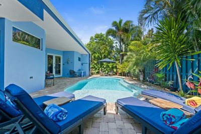 Relax and unwind by our private heated saltwater pool, featuring a sun shelf, bench seating, and ample loungers for sun or shade. Swimsuits are optional, and complimentary towels and WiFi are provided for your comfort. All guest rooms feature views of and direct access to the pool.